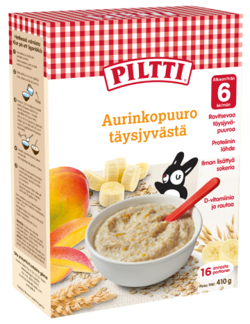 PILTTI Aurinkopuuro täysjyvästä on ravitseva, maitopohjainen täysjyväpuurojauhe vehnästä ja kaurasta banaanilla, mangolla ja omenalla. Tämä herkullinen puuro on kehitetty erityisesti 6 kuukauden ikäisille vauvoille.