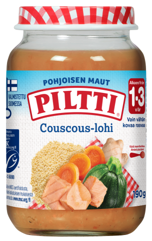 PILTTI Pohjoisen Maut Couscous-lohi 190g on ihana kala-ateria, jossa yhdistyvät kasvikset, kuskus ja villilohi*. Makua ateriaan lisää inkiväärijauhe. PILTTI Pohjoisen Maut Couscous-lohi 190g on helppo ja nopea kala-ateria taaperolle 12kk iästä alkaen, ja siinä on pieniä paloja pureskelun harjoitteluun.