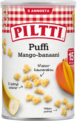 PILTTI Puffi Mango-banaani ovat mangon ja banaanin makuisia, yli 15kk ikäisten lasten tarpeisiin suunniteltuja maissi-kauranaksuja, jotka on helppo poimia pienillä sormilla!