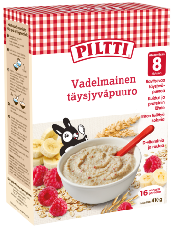 PILTTI Vadelmainen täysjyväpuuro on ravitseva, maitopohjainen täysjyväpuurojauhe vehnästä ja kaurasta banaanilla ja vadelmalla. Tämä maittava puuro on kehitetty erityisesti 8 kuukauden ikäisille vauvoille.